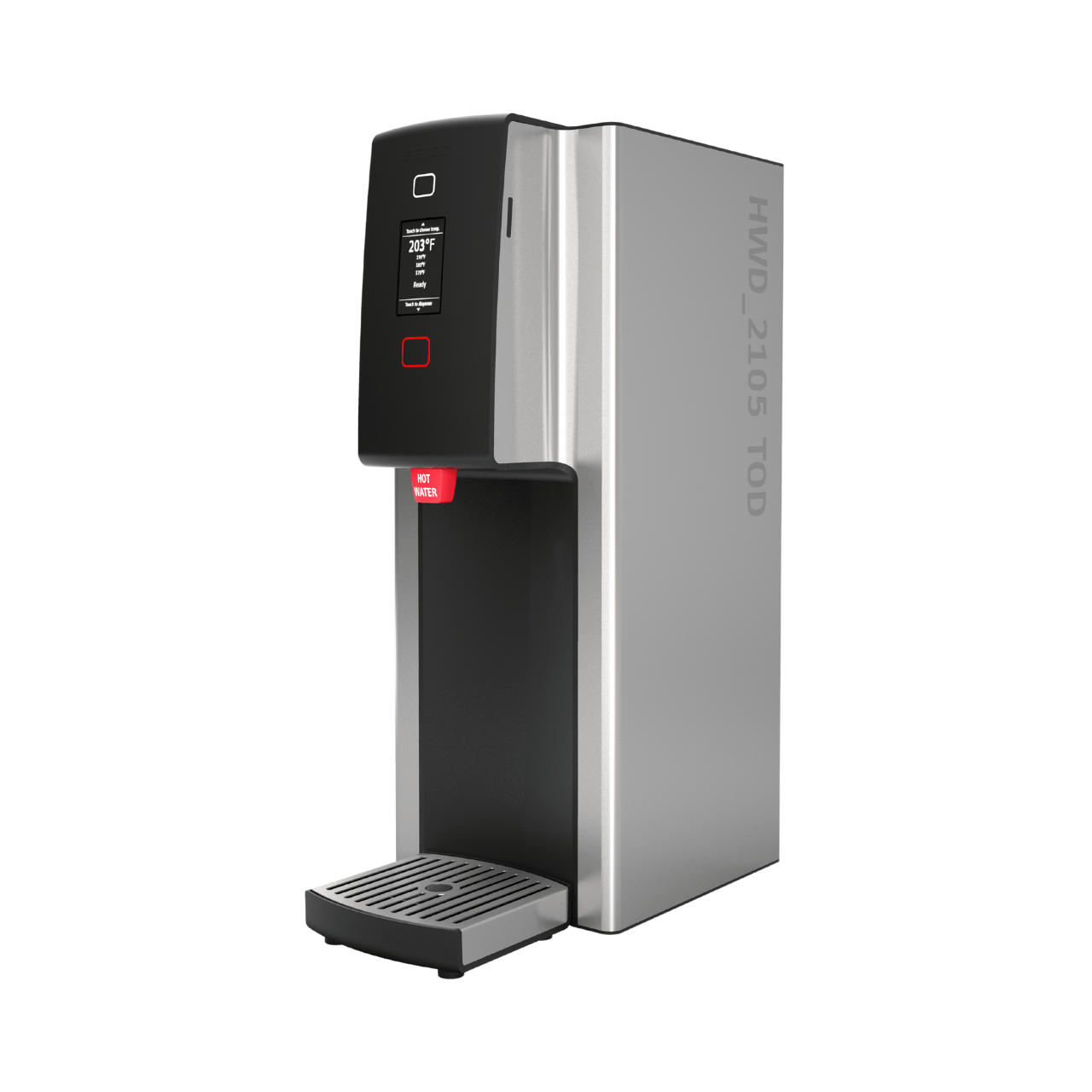 Equipped with temperature-on-demand dispensing technology the HWD-2105 TOD 5 gallon Hot Water Dispenser offers up to four programmable hot-water temperatures available in an instant. Its high-resolution display and intuitive user-friendly interface allows for easy temperature setting adjustment at the touch of a button. Designed with efficiency in mind, this brewer wraps up to four hot water dispensers into one streamlined unit - saving on cost, space, and labour - making for an ideal multi-temp hot-water solution.