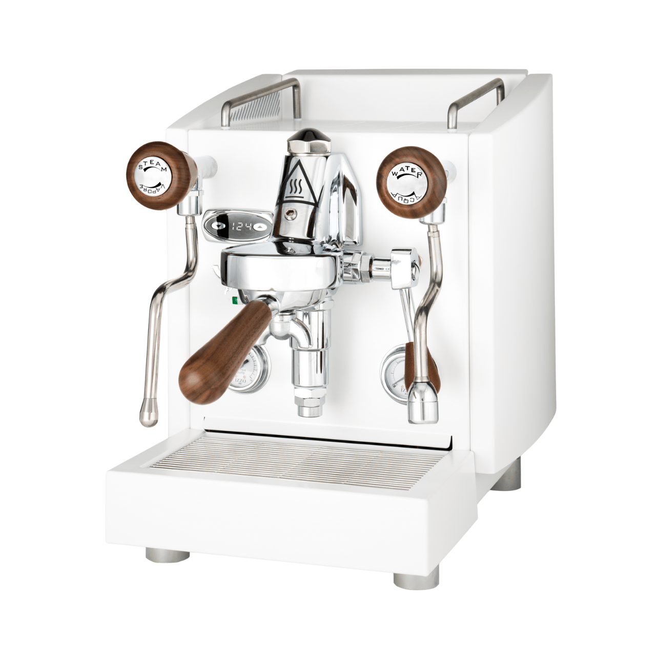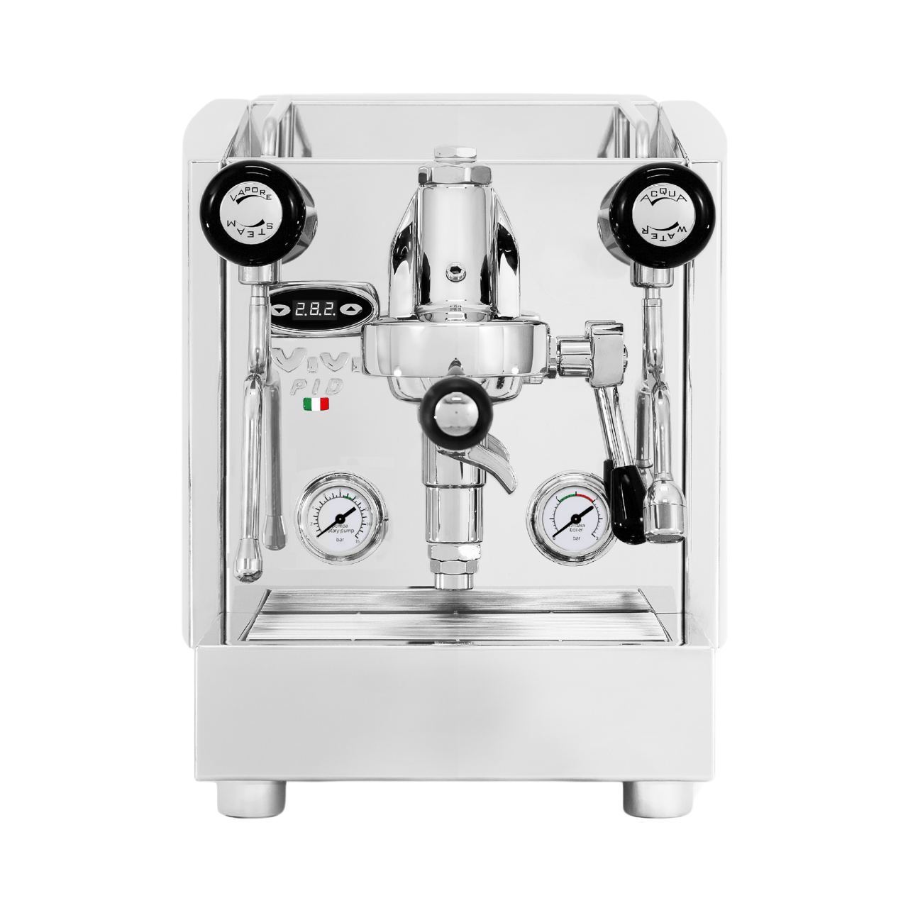 Vivi shares many of the premium features of the larger model Alex while still delivering powerful steam and hot water even with its slightly smaller boiler; a digital P.I.D. (with integrated shot timer) allows you to adjust overall steam pressure which will also adjust brew temperature in tandem to your liking; the convenient and safe cool-touch steam wand delivers powerful simultaneous steam. It's compact space-saving design with thermal compensated curved body panels will fits more easily onto kitchen counter tops and looks great at any angle.